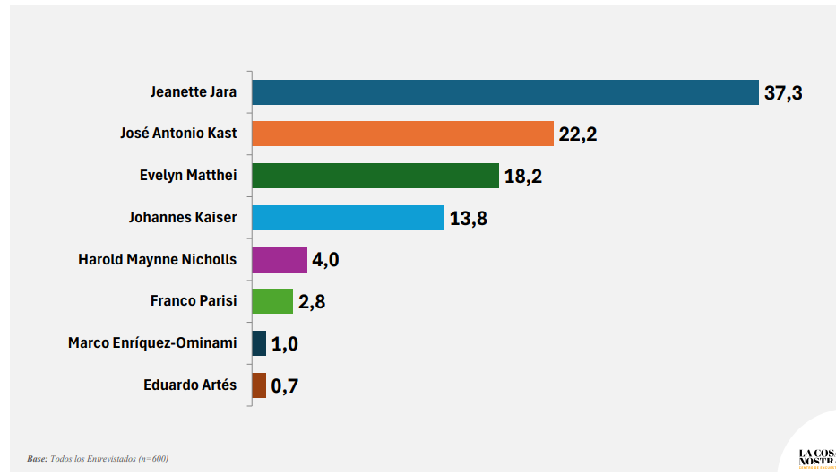 En la simulación de primera vuelta, Jeannette Jara (Pacto Unidad por Chile) lidera con un 37,3%, seguida por José Antonio Kast (Republicano) con un 22,2% y Evelyn Matthei (Chile Vamos) con un 18,2%. Les siguen Johannes Kaiser (13,8%), Harold Mayne-Nicholls (4%), Franco Parisi (2,8%), Marco Enríquez-Ominami (1%) y Eduardo Artés (0,7%). Estos resultados mantienen sin variaciones significativas los tres primeros lugares respecto al sondeo anterior.