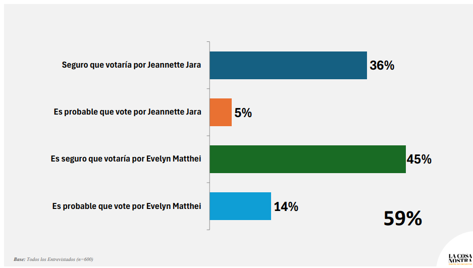 Jara vs. Matthei: La candidata de Chile Vamos, Evelyn Matthei, ganaría por una distancia mayor, alcanzando un 59%, mientras que Jara sumaría un 41%.