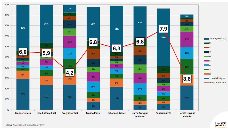 Finalmente, en el ítem de «qué sería más peligroso para el país», el candidato Eduardo Artés lideró negativamente la percepción de riesgo con 7,9 puntos, seguido por Marco Enríquez-Ominami y Franco Parisi, ambos con 6,8. Entre los principales contendores, Jara registró un nivel de peligro de 6,0, mientras que Kast obtuvo 5,9, y Matthei el más bajo con 4,2. (NP-Gemini-Bio Bio)